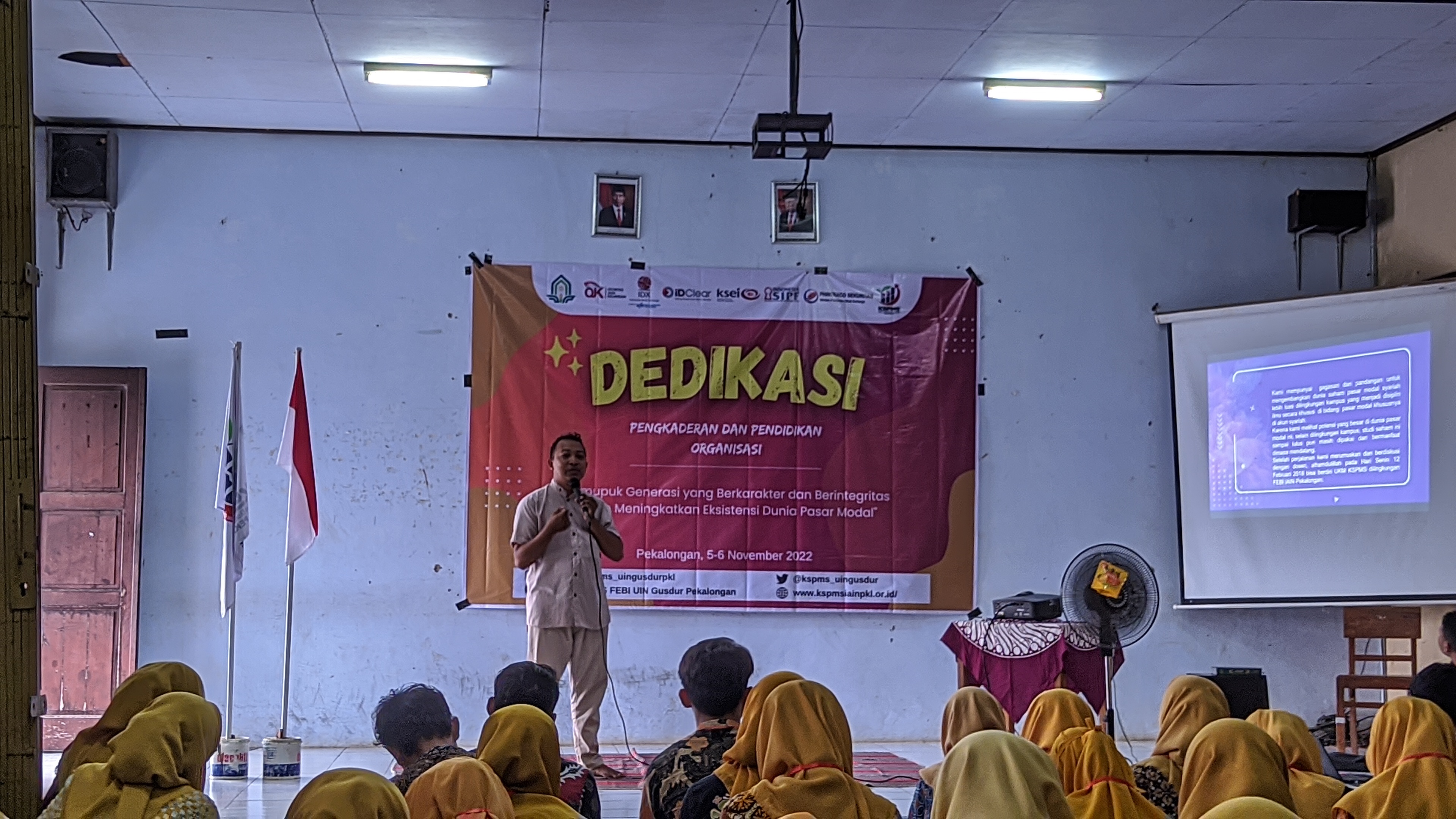 Pada hari Sabtu-Minggu, 5-6 November 2022 Unit Kegiatan Mahasiswa Kelompok Studi Pasar Modal Syariah FEBI UIN K.H. Abdurrahman Wahid Pekalongan melaksanakan kegiatan DEDIKASI (Pengkaderan dan Pendidikan Organisasi) yang merupakan salah satu program kerja dari Manajemen Sumber Daya Insani dengan bertemakan “Memupuk Generasi yang Berkarakter dan Berintegritas dalam Meningkatkan Eksistensi Dunia Pasar Modal". DEDIKASI / Pengkaderan dan Pendidikan Organisasi ini merupakan kegiatan tahunan yang dilaksanakan dengan tujuan untuk mendidik kader baru UKM KSPMS FEBI UIN K.H. Abdurrahman Wahid Pekalongan dan memberikan beberapa kajian, diantaranya kajian tentang antropologi kampus, legislatif, pengenalan dasar pasar modal dan instrumen pasar modal syariah. Selain itu, ada pengenalan terkait manajemen organisasi dan gambaran umum instrument pasar modal. Kegiatan DEDIKASI UKM KSPMS FEBI UIN K.H. Abdurrahman Wahid Pekalongan dilakukan secara offline di SMK Yapenda 1 Kedungwuni yang diikuti oleh 50 mahasiswa FEBI semester 1-5.